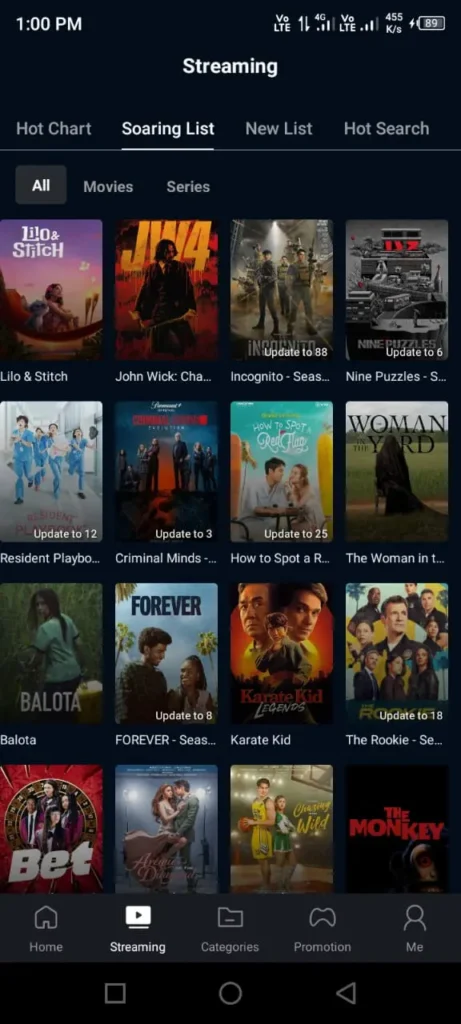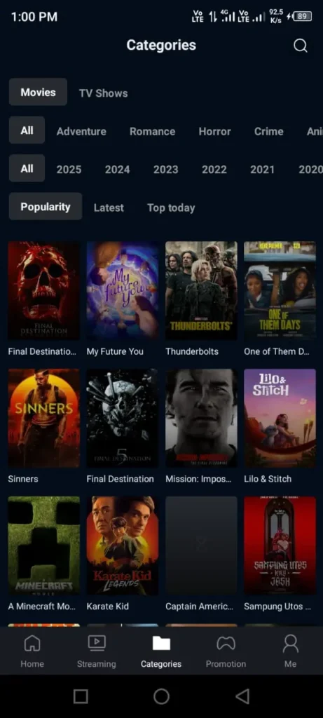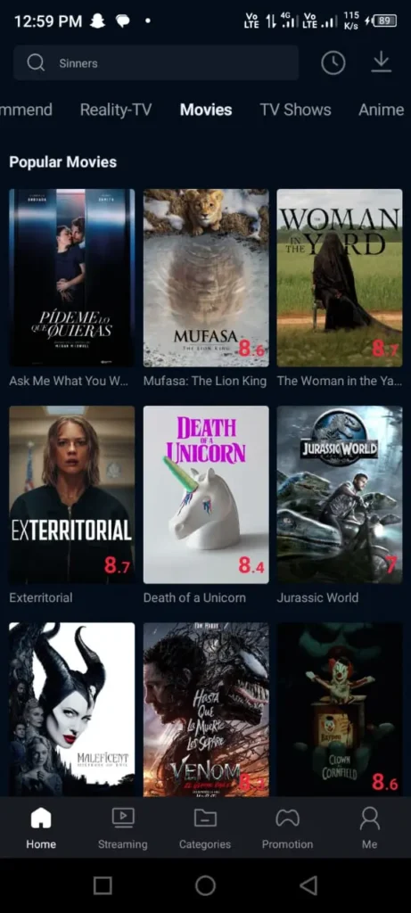 The home screen is filled with large movie posters arranged in clean rows. These posters are easy to scroll through, and they give you a quick visual idea of what the movie or show is about. Right at the top, you will also see a search bar where you can type the name of any movie or series and find it instantly.