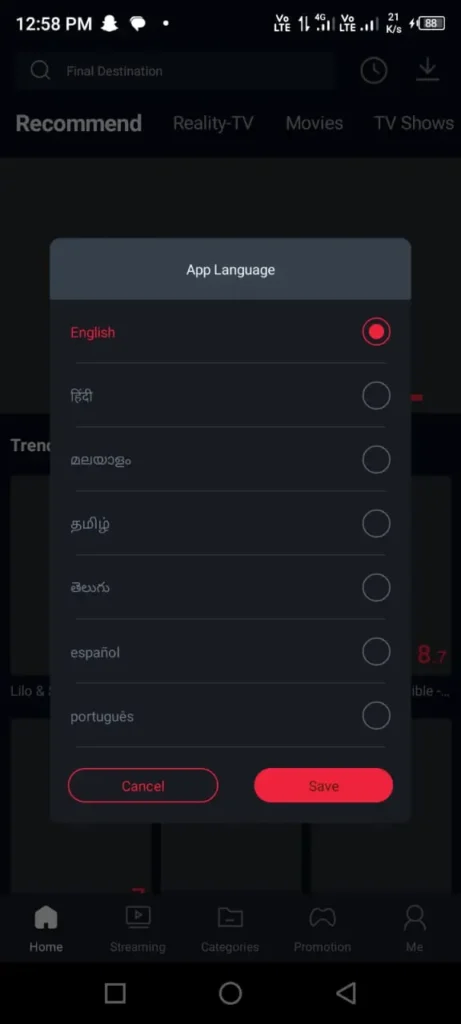 Once you select your language, the main screen of the app appears, and it looks bold and eye-catching with a red and black color theme. This color combo gives the app a strong and cinematic feel, kind of like being in a dark movie theater with glowing red lights. Visit this page https://ppcine.live/ppcine-for-tv/ to download PPCine for TV.